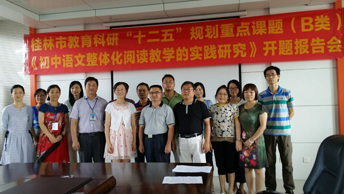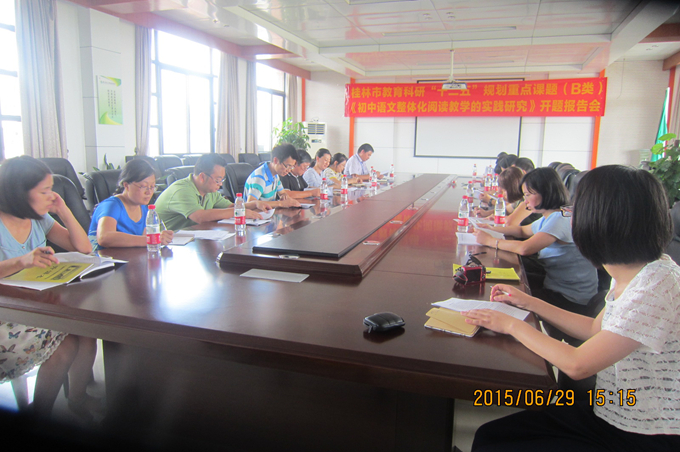 我校举行桂林市十二五重点课题开题报告会 语文组 2015年7月3日下午,我校在四楼会议室举行桂林市教育科研十二五重点课题(B类)《初中语文整体化阅读教学的实践研究》开题报告会